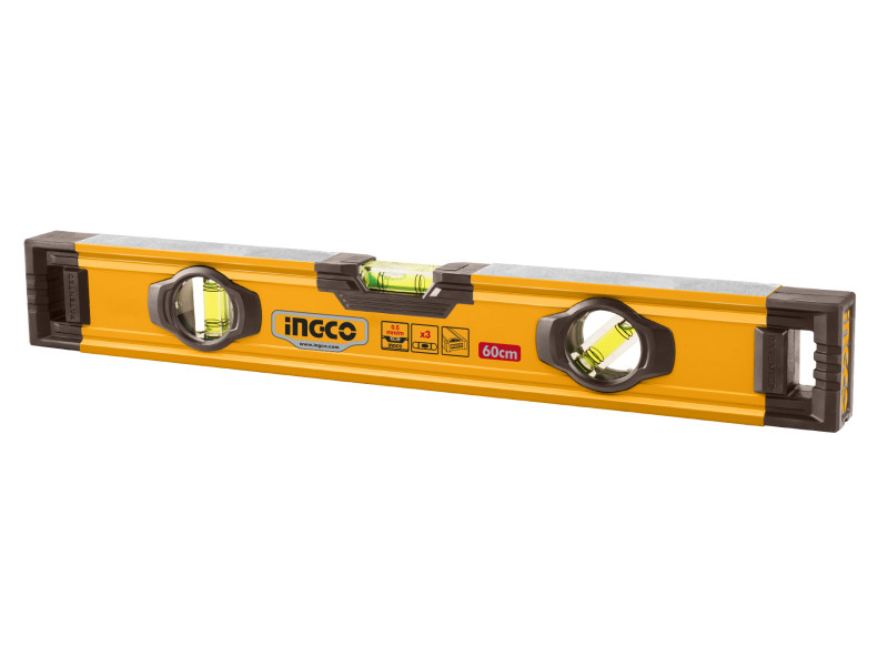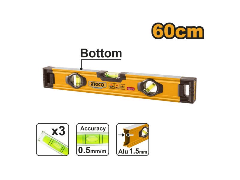A horizontális, vertikális stb. mérésekhez használatos.Nagy pontosságú vízmérték buborék, pontosabb mérés, három vízmérték buborék, több szög, hogy megfeleljen a vásárlók több mérési igényeinekHossz: 600 mm2 oldalon mart0.5 mm/m pontos libellákVastagság: 1.5 mmV-alak a gömbölyő felületekhez3 libellávalAnyaga: alumínium és ABS műanyag Szállítási terjedelem: 1 db vízmérték, Kartondobozban