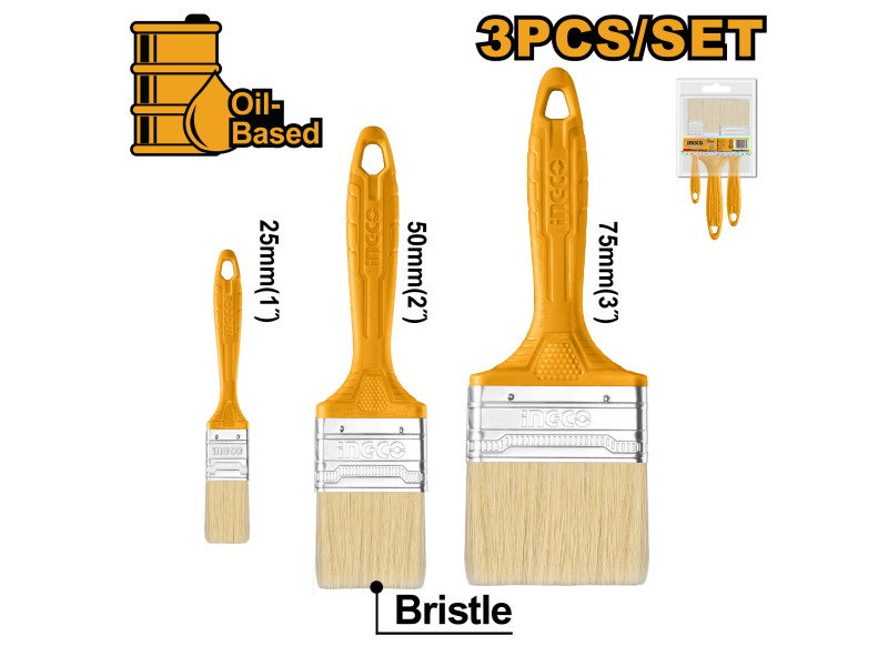 Festés1. Költséghatékony üreges nyélű festőecset készlet2. Speciális formájú nyél3. Finom festési hatásOlaj bázisú festékekhezMéretek: 25 mm (1"), 50 mm (2"), 75 mm (3")Műanyag markolat Szállítási terjedelem: 3 db ecset, Bliszterben