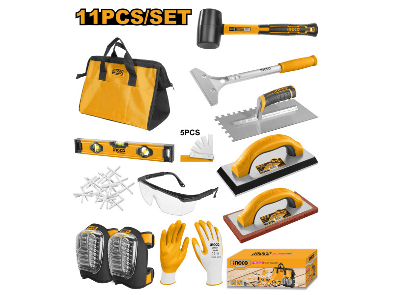 Csempézéshez szükséges szerszámkészletEgy teljes csempe fektető eszközkészlet és a hozzá tartozó munkavédelmi felszerelések10 részes burkoló szett tartalma:1 db gumi kalapács1 db festékkaparó, 5 db tartalék penge1 db 280 x 130 mm fogazott glettvas1 db 240 x 100 mm gumis fugázó1 db 230 x 100 mm finom gumis fugázó1 db 400 mm vízmérték1 db védőszemüveg1 db nitril mártott kesztyű1 db térdvédő250 db fugakereszt1 db nitril mártott kesztyű1 db 400 mm vászontáska Szállítási terjedelem: Karton dobozban