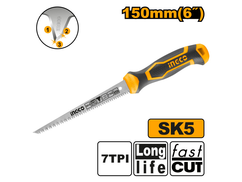 Bambusz vágása, kerti metszés, kerti modellezés, háztartási asztalosmunka, erdészeti termelés, kültéri kemping és kaland, stb.1. Az SK5 fűrészlap hosszabb élettartamú;2. A fogak három oldalon vannak élezve, a vágófelület sima, gyorsabb és élesebb; 3. A kétszínű, gumi bevonatú fogantyú kényelmesen tartani, erős és tartós.Méret: 150 mm (6")Anyaga: Tajvani SK5Fogosztás: 8TPIHőkezelt fogak3 élű fogkialakításGyors vágás és hosszú élettartam Szállítási terjedelem: 1 db gipszkarton fűrész, Bliszterben