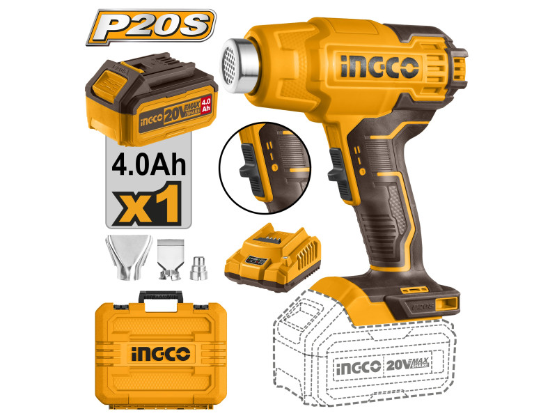 A lítium elektromos hőpisztolyt festékfoltok eltávolítására, festék lehúzására, festésre és lakkozásra, fagyott csövek felolvasztására, csempék és kitömőanyagok lazítására, ragasztók újraolvasztására, matricák eltávolítására, viaszolásra és viasz eltávolítására, hőzsugorító csövekhez, csomagoláshoz való hőzsugorításra, műanyag csövek és lemezek hajlítására stb. használják.1. Hosszú élettartamú fűtőmag2. Fejjel lefelé is helyezhető használatra3. Számos tartozék különböző munkakörülményekhez4. 2 szinten állítható a levegő mennyisége és a szélsebesség, a hőmérséklet elérheti a 550?-ot, a szélsebesség pedig a 200L/percet5. A tok és a fogantyú kialakítása kényelmes fogást biztosít6.4.0Ah-s akkumulátorcsomaggal felszerelve, erős állóképességFeszültség: 20 VHőmérséklet: 300 / 550° CLégáramlat: 100 / 200 l/percTöltő feszültség: 220 - 240 V ~ 50 / 60 Hz Szállítási terjedelem: 1 db 4.0 Ah akkumulátor (FBLI2002), 1 db töltő (FCLI2001E), 3 db fúvóka, Kofferben