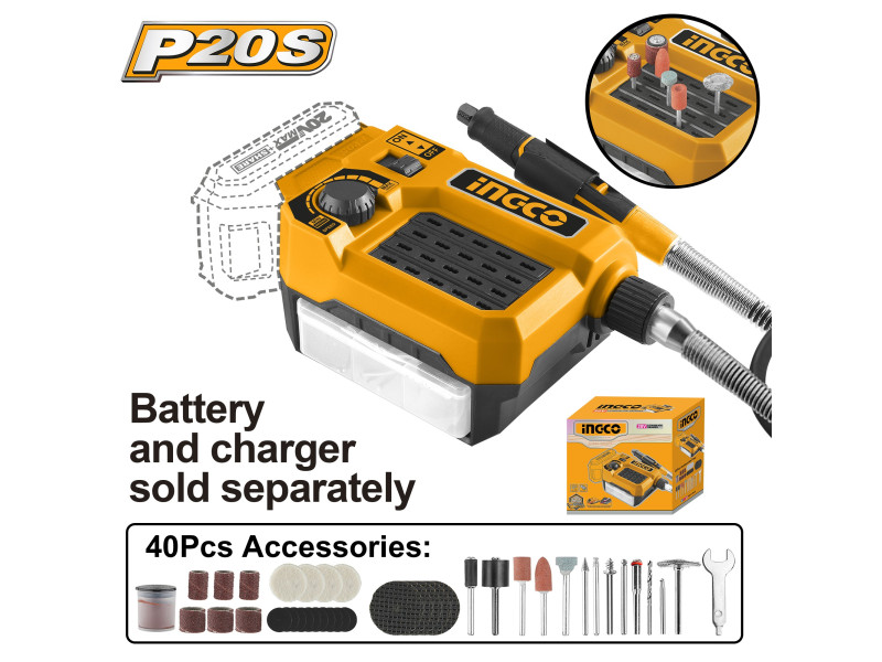 1. Vágás;2. Csiszolás;3. Fúrás;4. Polírozás;5. Faragás;1. Teljes kiegészítők, a 40 darabos kiegészítők különböző helyzetekre alkalmasak;2. Többsebességes beállítás, több választási lehetőség;3. Egy gép többféle felhasználásra, polírozásra és rozsdamentesítésre, csiszolásra és gravírozásra, vágásra és fúrásra;4. 100CM hosszú rugalmas tengelyű tokmány, nincsenek korlátok a műveletben;5. A test tokmánytartóval van tervezve, ami még kényelmesebb.Feszültség: 20 VÜresjárati fordulatszám: 10000 - 35000 f/pBefogótüske mérete: 3.2 mmÁllítható sebesség  Szállítási terjedelem: Akkumulátor és töltő nélkül, 1 db flexibilis hosszabbító, 40 db tartozék, 1 szett szénkefe, Kartondobozban