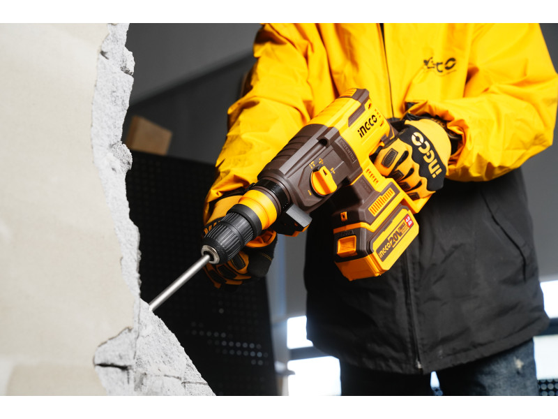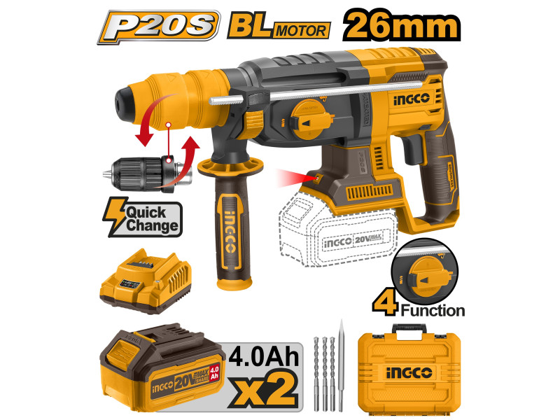 A gép betonban, téglában történő kalapácsfúráshoz és véséshez készült. Alkalmas továbbá ütés nélküli fúráshoz fában, fémben, kerámiában és műanyagban.Erős, kefefej nélküli motor szállít 0-1100rpm, 0-5000bpm és 2,5J ütőenergiát a legigényesebb alkalmazások kezelésére. Az SDS plus szerszámtartók akár 26mm-es bitet is képesek tartani, és a legjobb választás könnyű kalapácsfúráshoz és véséshez. A nyomatékhatároló kuplung megakadályozza a fogaskerék károsodását, automatikusan kikapcsolja a fogaskerekeket, ha a bit beragad. A változó sebességű ravasz lehetővé teszi a felhasználó számára, hogy a sebességet az alkalmazáshoz igazítsa a nagyobb sokoldalúság érdekében. 4 módos működés a "csak forgás", "kalapácsolás forgással", "csak kalapácsolás" vagy "véső zár" számára. Az LED fény megvilágítja a munkaterületet. Ergonomikus, puha gumi markolat kialakítás a kényelmes működés érdekében.Feszültség: 20 VÜresjárati fordulatszám: 0 - 1100 f/pÜtés tartomány: 0 - 5000 ütés/percÜtés energia: 2.5 JMax. fúrás méret: Betonban: 26 mm, Acélban: 13 mm, Fában: 30 mmSDS-Plus tokmány rendszerBeépített LED lámpa Szállítási terjedelem: 3 db kőzetfúró (8, 10, 12 mm) SDS-Plus, 1 db vésőszár, 1 db gyorstokmány, 2 db 4.0 Ah akkumulátor (FBLI2002), 1 db töltő (FCLI2001E), Kofferben