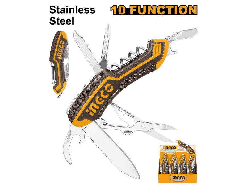 10 funkcó, kés, sörnyitó, olló, konzervnyitó, PH csavarhúzó, SL csavarhúzó, dugóhúzó, Köröm tisztító, köröm reszelő, kulcstartó