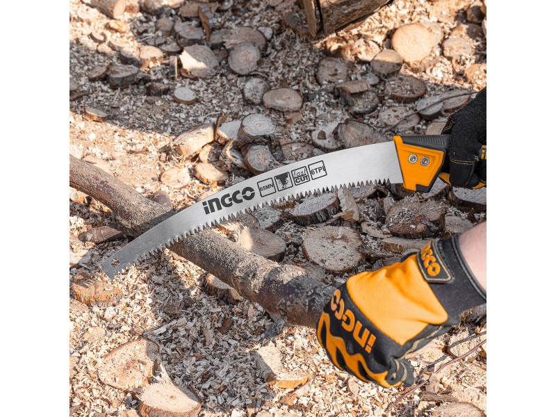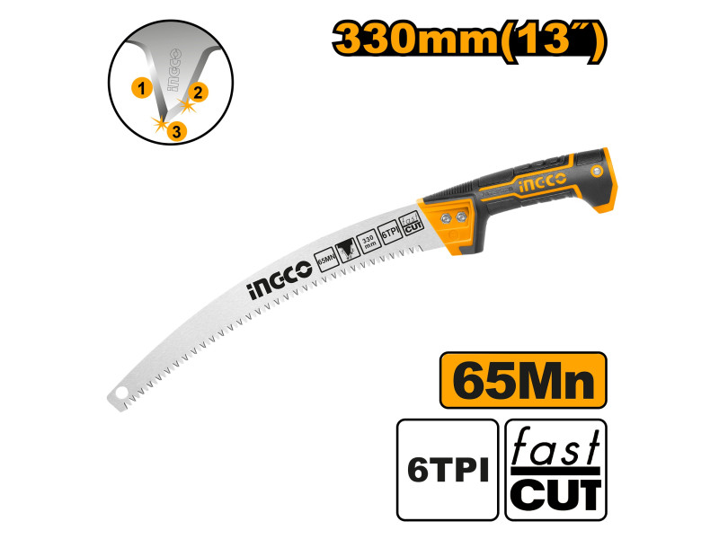 Bambusz vágása, kerti metszés, kerti modellezés, háztartási asztalosmunka, erdészeti termelés, kültéri kempingezés és kaland, stb.1. A fűrészlap 65Mn acélból készült, magas frekvenciájú edzéssel, a fogak keménysége HRCą52°, nagy keménységű és jó kopásállóságú;2. A fogak három oldalon vannak élezve, ami nagyobb vágási hatékonyságot biztosít;3. A fűrészlap ívelt, ami rugalmasabbá teszi a fűrész ívét, erősebb húzóerővel, nem akad el, sima vágási felületet biztosít, gyorsabb és élesebb, és kevesebb munkát igényel a használata;4. Az anti-leeső fogantyú csavarokkal van megerősítve, kényelmes fogást biztosít, erős és tartós;5. A fűrészlap egy speciális műanyaggal van lezárva, ami a használat utáni tárolást könnyíti meg, és a hegyes fogakat csomagolja, hogy megakadályozza mások sérülését;Méret: 330 mm (13")Anyaga: 65MnFogosztás: 6TPI3 élű fogkialakításGyors vágás Szállítási terjedelem: 1 db ágfűrész, Bliszterben