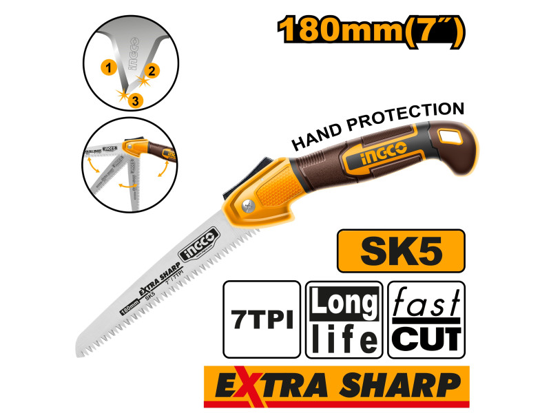 Kerti metszéshez, kertépítési formázáshoz, barkácsoláshoz, erdészeti munkákhoz, kültéri kempingezéshez és felfedezéshez, valamint vízcsővágáshoz használható.SK5 acél penge, fogak nagyfrekvenciás edzéssel, HRCą52° keménység, nagy szilárdság, jó rugalmasság, kiváló kopásállóságHárom élre köszörült fogazat: erősebb húzóhatás, nem szorul be, simább vágás, gyorsabb élezés, nagyobb hatékonyság, hosszabb élettartamBiztonsági zár: biztonságosabb használat, kompakt tárolásHáromszínű, csúszásgátlós markolat, csavarozott erősítéssel, kényelmes fogás, masszív kivitel