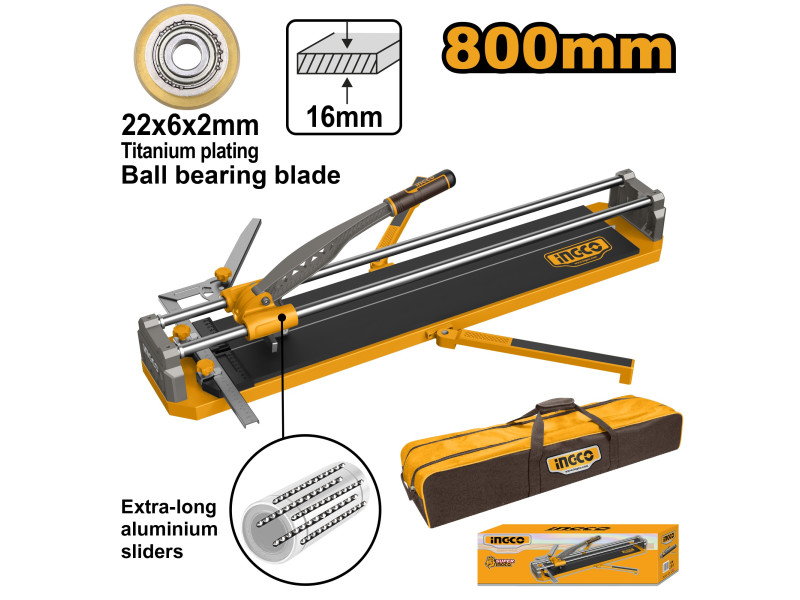 Gyors csempevágási sebességEgyszerű, kényelmes és biztonságos működésNincs szükség elektromosságra, vízre, nincs zaj, nincs porA fogantyú gumi bevonatú és ergonomikusSzövettáskában Max. vágás hossz: 800 mmMax. vágás vastagság: 16 mmAcél alap mérete: 1015 x 200 mmCsapágyazott vágókerék anyaga: Volfrámkarbid, titán bevonattalVágókerék mérete: 22 x 6 x 2 mmMultifunkció: egyenes vágás, átlós vágás Szállítási terjedelem: 1 db csempevágó, 1 db hordtáska, kartondobozban