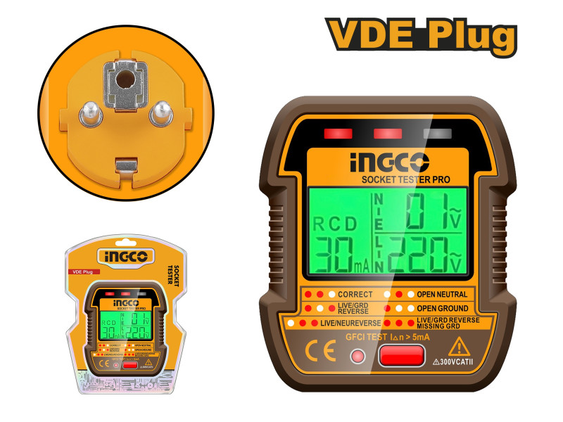 Főként arra használják, hogy megállapítsák, helyesen vannak-e bekötve a konnektorok vagy a vezetékek.1. Nagy színes képernyő2. Pontos leolvasásVDE csatlakozó, LCD kijelzőFeszültségtartomány: AC 90 - 250 VFrekvencia: 45 - 65 HzSzivárgási feszültség: AC 0 - 90 VRCD teszt: >30 mAHáttérvilágítás Szállítási terjedelem: Hétféle teszt visszajelzése:Helyes csatlakozásFöldelés hiánya (földvezeték szakadás)Nullavezeték hiánya (nullavezeték szakadás)Fázisvezeték hiánya (fázisvezeték szakadás)Fázisvezeték és földvezeték felcserélveFázisvezeték és nullavezeték felcserélveFázisvezeték és földvezeték felcserélve, földvezeték hiányzik Szállítási terjedelem: Bliszterben