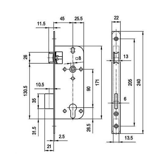 Europrofilú hengerzárbetétes, reteszes és csapdás, kétcsukású bevésőzár