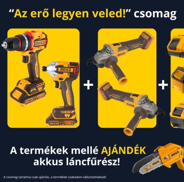 Vásárolj nálunk nettó 100.000 Ft értékben INGCO termékeket december 20-ig és megajándékozunk egy akkus láncfűrésszel! A láncfűrész mellé természetesen akkumulátort és gyorstöltőt is adunk!