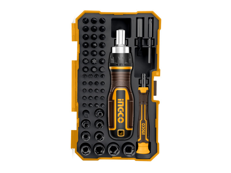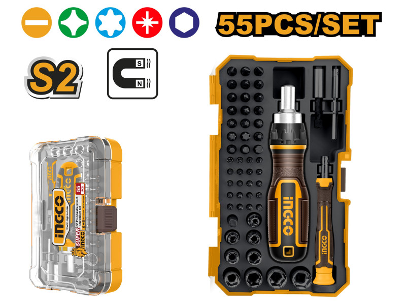 Csavarok és csavarok eltávolítása1. Különböző specifikációkú csavarhúzó fejek és foglalatok, hogy több felhasználási forgatókönyvet lehessen kielégíteni2. A csavarhúzó fejek Cr-V anyagból készülnek, hogy megfeleljenek a nagyobb nyomaték és élettartam követelményeinek3. Racsnis fogantyú, nagyobb munkamegtakarítás4. Alkalmas különböző precíziós műszerek szétszerelésére és karbantartására55 darabos csavarhúzó készlet:21 db 6,35 × 25 mm-es csavarhúzó bit: o SL4, SL5, SL6, o PH1, PH2 (3 db), PH3, o PZ1, PZ2, PZ3, o T10, T15, T20, T25, T30, T40, o H3, H4, H5, H620 db 4 × 28 mm-es precíziós csavarhúzó bit: o SL1.5, SL2, SL2.5, SL3, o PH000, PH00, PH0, PH1, o T6, T7, T8, T9, T10, T15, T20, o H1.5, H2.0, H2.5, H3.0, H4.09 db 1/4" × 20,5 mm-es dugókulcs: 4 mm, 5 mm, 6 mm, 7 mm, 8 mm, 9 mm, 10 mm, 11 mm, 12 mm1 db 46 mm (25 mm) bit adapter1 db 4 × 60 mm bit tartó1 db 6,35 × 50 mm bit tartó, Műanyag tartó