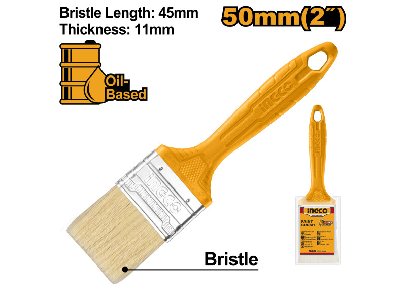 Festés1. Költséghatékony egyszer használatos festőecset üreges nyéllel2. Speciális stílusú nyél3. Finom festési hatásSzélesség: 50 mm (2")Olaj bázisú festékekhezEgyedi műanyag markolatSörtehossz: 45 mmSörtevastagság: 11 mm Szállítási terjedelem: 1 db ecset, Műanyag csomagolás