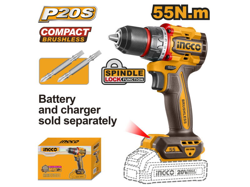 Csavarozás, fúrásKefe nélküli motor, max. 55Nm nyomaték13 mm-es fém tokmány, stabil fogásKétsebességes állítás22+1 fokozatú nyomatékállítás, különféle munkákhoz