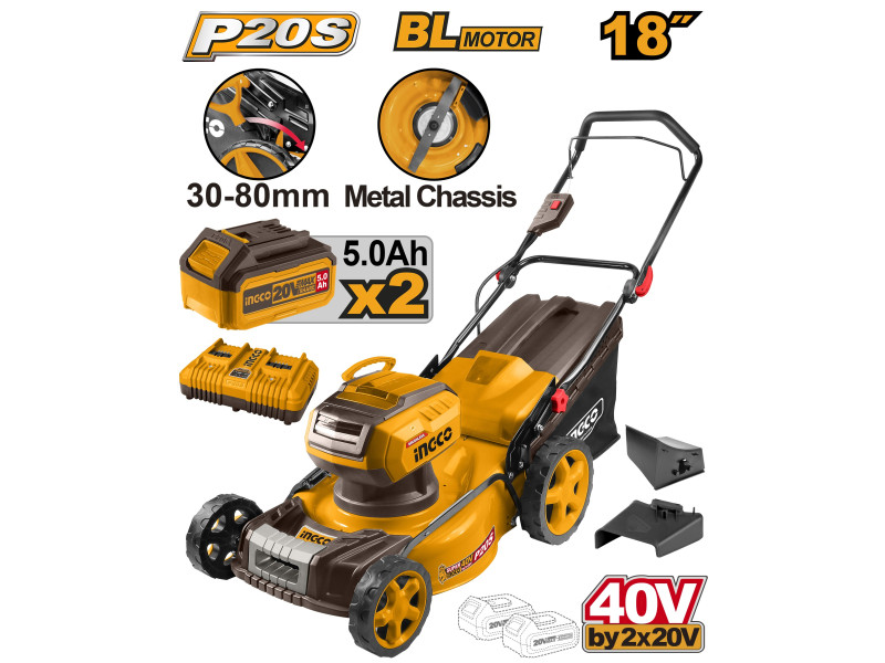 Technikai adatokFeszültség (V)40 (2 x 20)Üresjárati fordulatszám (ford/perc)2800Max. vágás átmérő (mm)460Vágásmagasság (mm)30 80Vágásmagasság állítási pozíciók száma8Fűgyűjtő térfogata (l)60Funkciókgyűjtés, mulcsolás, oldalra szórásSzállítási terjedelem: 2 db 5,0 Ah akkumulátor, 1 db dupla töltő, 1 db fűgyűjtő kosár, 1 db mulcsoló adapter, 1 db oldalra szóró adapter