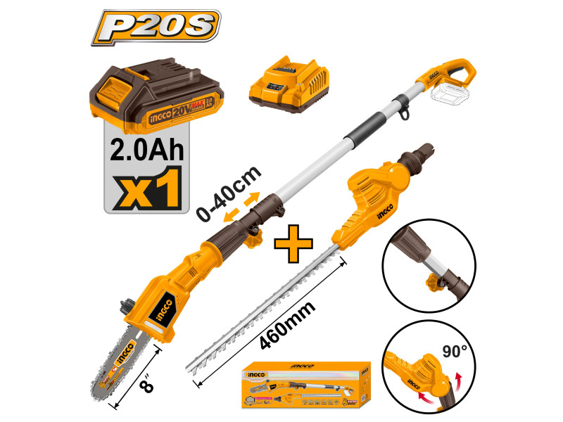 A gép háztartási használatra szánt, sövények és bokrok vágására és nyírására, vagy magasban lévő faágak metszésére, miközben a felhasználó a földön tartózkodik.2 in 1: Rúddal ellátott ágvágó a faágak metszésére és rúddal ellátott sövényvágó a magas sövények vágására. Magasságban állítható teleszkópos nyél forgatható fejjel, 3 m-es elérési távolsággal. A sövényvágó fej 7 különböző pozícióban állítható, így elérheti a nehezen hozzáférhető ágakat, és bármilyen szögben vághatja a sövényét. A kettős működésű lézerrel vágott pengék gyors és tiszta vágási eredményt biztosítanak. Láncfűrész fej automatikus láncolajozással. Technikai adatokAkkus magassági sövényvágó (CPHT2016012)Feszültség (V)20Kés vágás hossz (mm)460Max. sebesség (ford/perc)2800Max. vágás átmérő (mm)18Lézer edzett késIgenTeljes gép max.hossz (m)2,4Akkus magassági ágvágó fűrész (PSLI20081)Feszültség (V)20Láncvezető mérete (mm)200Lánc sebessége (m/s)4,8Olaj tartály kapacitás (ml)70Teljes gép max. hossz (m)2Szállítási terjedelem: 1 db 2,0 Ah akkumulátor, 1 db töltő