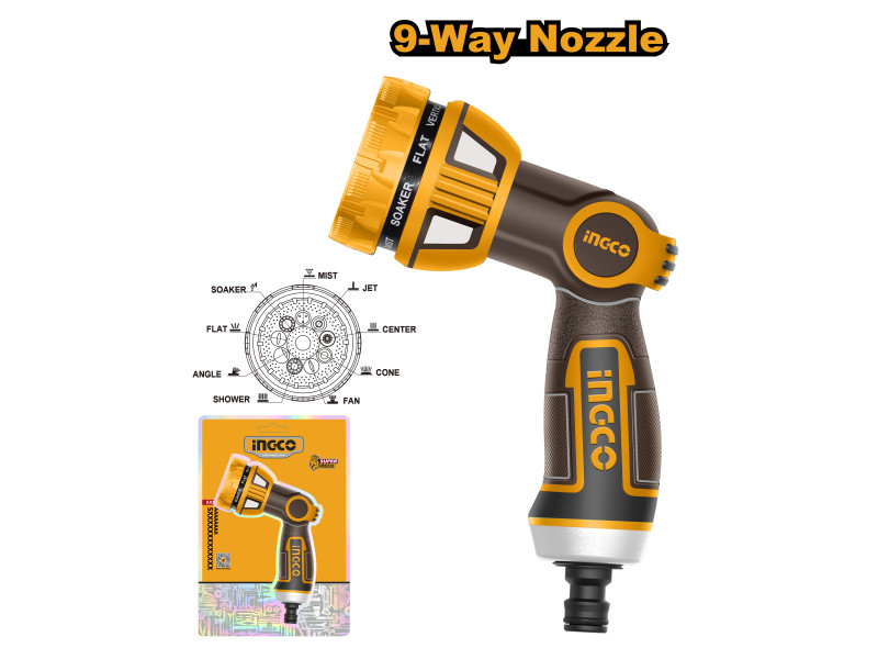 9-féle állítható vízpermetminta, öntözéshez, öblítéshez, tisztításhoz használható.U-alakú kapcsoló, alul cinkötvözet + ezüstözés, fő anyag: ABS, 9 szórási típus