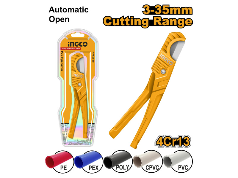 Műanyag csövek vágása, csövek javítása és telepítéseAlumínium ötvözetből készült fogantyú, kényelmes fogás. A penge Teflon bevonatú, ami élesebbé és tartósabbá teszi. Farokzár a könnyű tárolás érdekében.Hossz: 210 mmAnyaga: 4Cr13Vágó átmérő: 3 - 35 mmAutomata nyitás funkció Szállítási terjedelem: 1 db PVC csővágó olló, Bliszterben