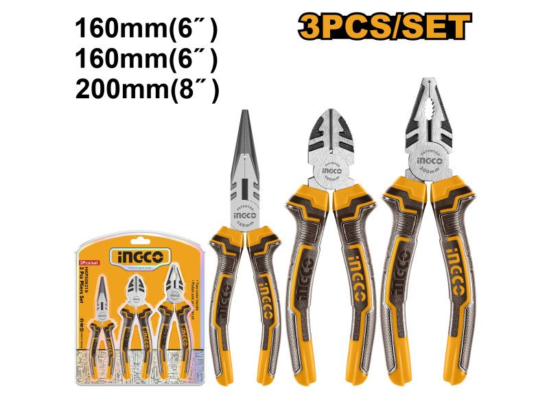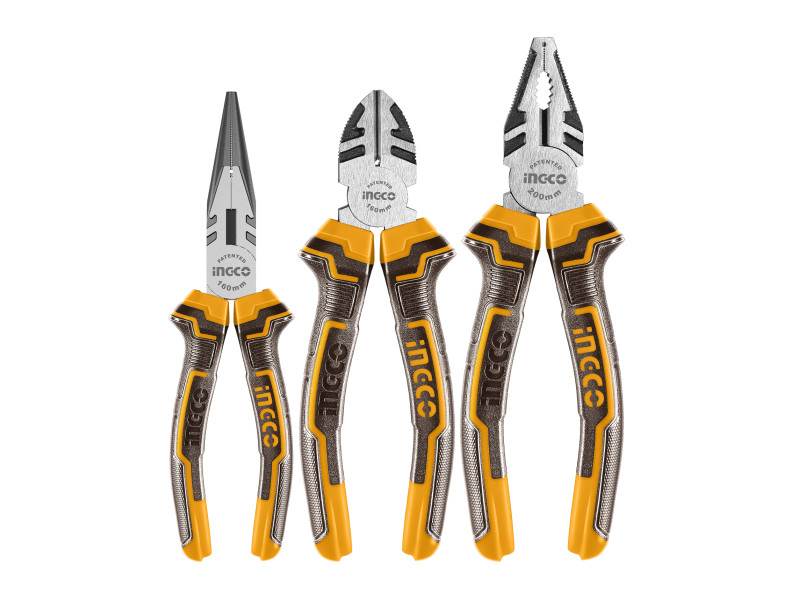 1. Csavarok, anyák, acél drótok stb. befogása.2. Acél drótok, vas drótok, réz drótok stb. vágása.1. Kétszínű, gumi bevonatú fogantyú, szép megjelenés, kényelmes fogás, csúszásmentes és kopásálló2. Magas frekvenciájú edzéskezelés a pengén, nagy vágóerő3. Teljes hőkezelés, hosszú élettartamMéretek: kombinált fogó: 200 mm (8"), hosszúcsőrű fogó: 160 mm (6"), oldalcsípő fogó: 160 mm (6")Polírozott és rozsdamentes olajos védelem2 színű markolat Szállítási terjedelem: 1 db kombinált fogó, 1 db hosszúcsőrű fogó, 1 db oldalcsípő fogó, Bliszterben