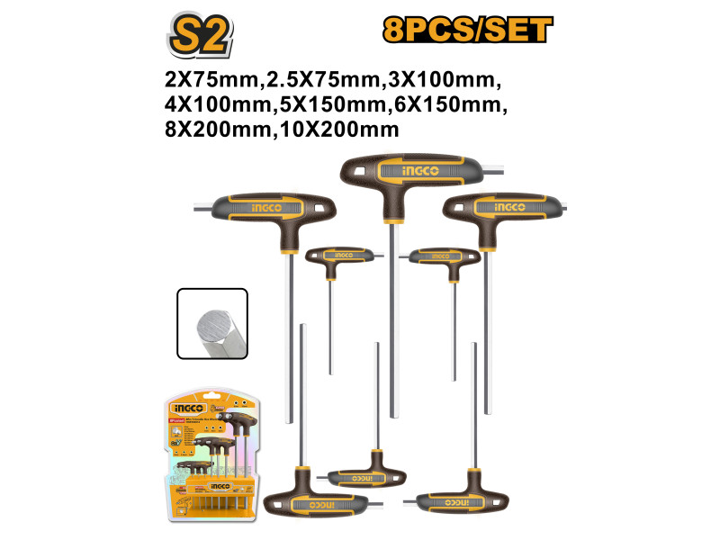 Gépek és berendezések karbantartása1. A fogantyú egy akasztólyukkal van ellátva, amely megkönnyíti a felakasztást és tárolást.2. A háromszínű fogantyú ergonomikusan tervezett, hogy illeszkedjen a kéz formájához és megkönnyítse az erőkifejtést.3. S2 acélból kovácsolt, tartós, jó keménységű és nagy szívósságú.Méretek: 2 x 100 mm, 2.5 x 100 mm, 3 x 100 mm, 4 x 150 mm, 5 x 150 mm,, 6 x 150 mm, 8 x 200 mm, 10 x 200 mmAnyaga: S2Hőkezelt és krómozott Szállítási terjedelem: 8 db imbusz T-kulcs S2, Bliszterben