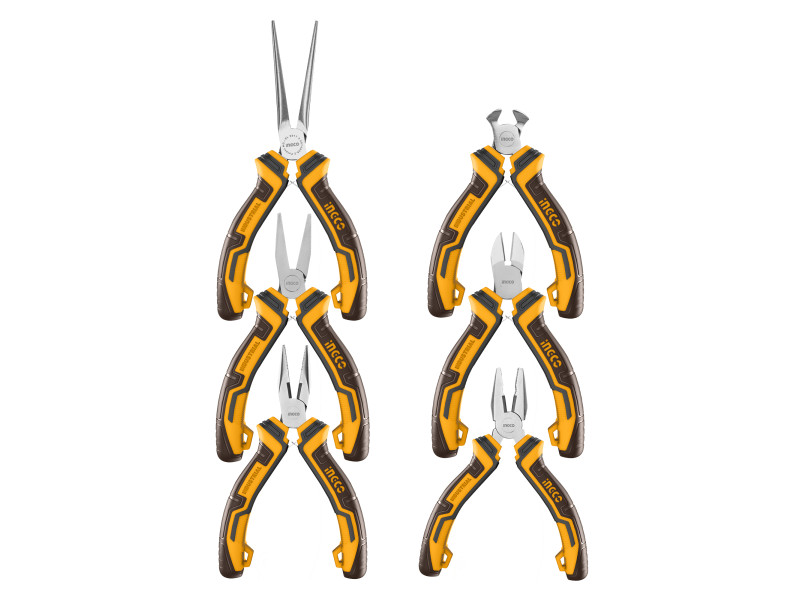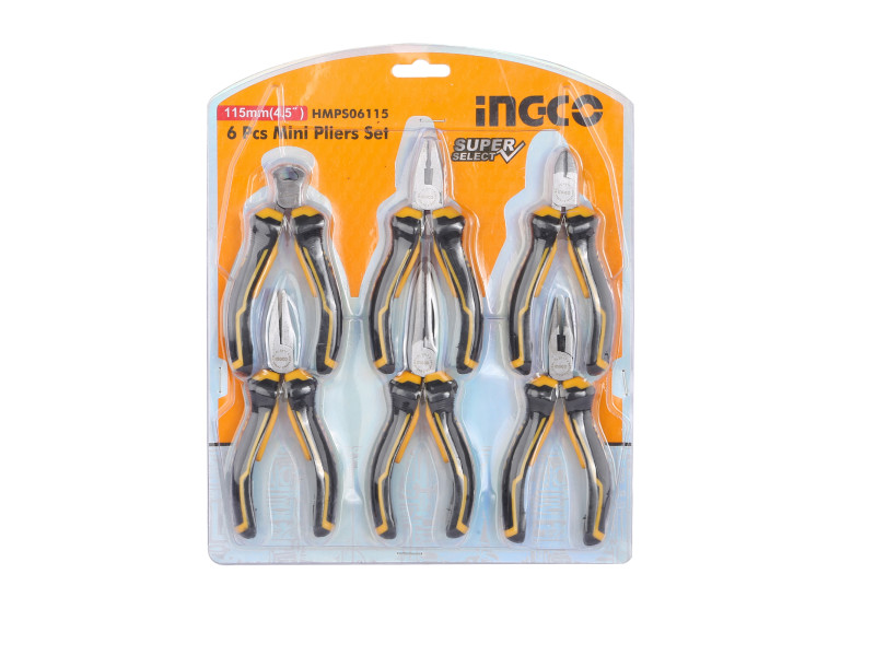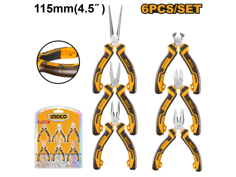 1. Vasdrótok szorítására, vágására, tekercselésére stb. használható.2. Elektronikai alkatrészek drótjainak szorítására, drótcsatlakozók hajlítására és tekercselésére stb. használható.3. Csavarok és anyák szorítására és rögzítésére stb. használható.1. Háromszínű, gumi bevonatú fogantyú, szép megjelenés, kényelmes fogás, csúszásmentes és kopásálló2. Pengemű rugós kialakítás, nyomás és visszapattanás, munkamegtakarító működés3. Mini kialakítás, kis méret, könnyen hordozható4. Teljes kovácsolás, hőkezelés, erős és tartósMéret: 115 mm (4.5")2 színű markolat Szállítási terjedelem: 1 db kombinált fogó, 1 db oldalcsípő fogó, 1 db homlok csípő fogó, 1 db hosszúcsőrű fogó, 1 db laposcsőrű fogó, 1 db kerekcsőrű fogó, Bliszterben
