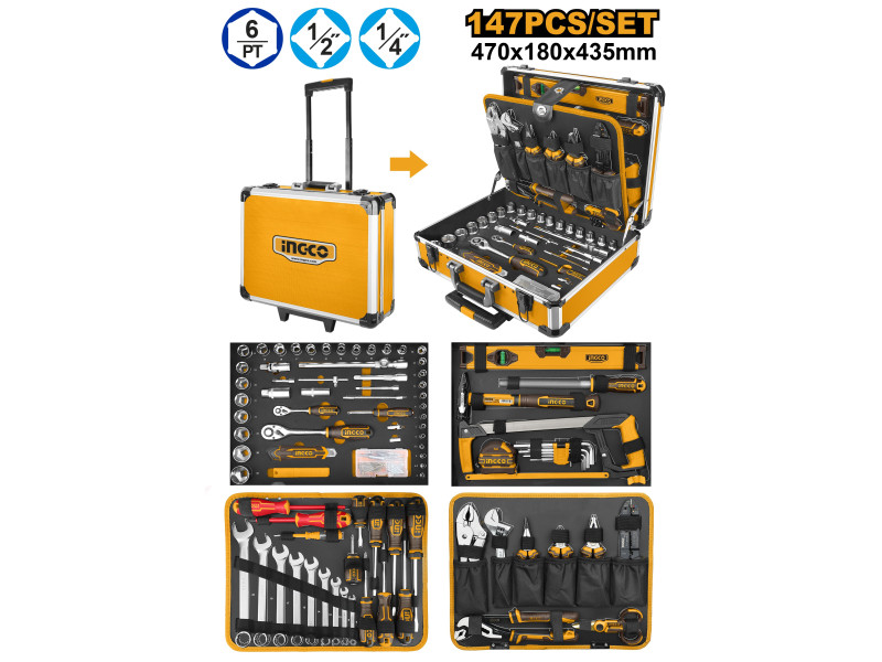 Otthoni/autó javító szerszámkészlet többféle szerszámmal a javításhoz és szétszereléshez1. Az INGCO márkájú alumínium targonca dobozt használjuk csomagolásra, könnyen hordozható2. Néhány kéziszerszámot nagy szilárdságú CRV és CR-MO fém anyagokból készítünk: Az összes fém anyagot nagyfrekvenciás hőkezeléssel készítjük, tartósak. A fogantyú a legújabb háromszínű fogantyút használja, amely kényelmes fogást és szép formát biztosít.3. A szerszámok széles választékban és specifikációkban kaphatók, és különböző helyszíneken és különböző javításokban használhatók. Többé nem kell aggódnia, hogy nem talál megfelelő specifikációjú szerszámokat.A készlet tartalma: 1 db 200 mm félköríves acélreszelő, 1 db 40 cm vízmérték, 1 db 300g gépész kalapács, 1 db 300 mm fémfűrész keret, 1 db 5 m acél mérőszalag, 9 darabos imbuszkulcs készlet (méretek: 1,5 / 2 / 2,5 / 3 / 4 / 5 / 6 / 8 / 10 mm), 1 db 17,5 cm (7") kombinált fogó, 1 db 15 cm (6") hosszú csőrű fogó, 1 db 15 cm (6") oldalcsípő fogó, 1 db 21,5 cm (8,5") kábelcsupaszító fogó, 1 db 25 cm (10") vízpumpafogó, 1 db 20 cm (8") állítható csavarkulcs, 1 db 25 cm (10") patentfogó hajlított pofával, 1 db 21,5 cm (8,5") olló, 9 db Racsnis csillag-villáskulcs (méretek: 6 / 8 / 10 / 12 / 14 / 15 / 17 / 19 / 22 mm), 4 db Csavarhúzó lapos (SL8*150 / SL6*125 / SL5*100 / SL6.5*38), 3 db Phillips csavarhúzó (PH2*150 / PH1*100 / PH2*38), 1 db 6,35 mm (1/4") mágneses szár, 2 db szigetelt csavarhúzó (SL5125 / PH2100), 1 db fáziskereső ceruza, 1 db 12,7 mm (1/2") racsnis hajtószár, 45T, 1 db 6,35 mm (1/4") racsnis hajtószár, 45T, 1 db 6,35 mm (1/4")*150 mm Behajtószár nyéllel, 1 db 6,35 mm (1/4")*150 mm flexibilis hosszabbító szár, 1 db 1/2" (F) -> 3/8" (M) háromirányú adapter, 1 db 12,7 mm (1/2") gépi csuklós csatlakozó, 1 db 6,35 mm (1/4") gépi csuklós csatlakozó, 2 db 12,7 mm (1/2") hosszabbító szár: 150 mm (5"), 250 mm (10"), 2 db 6,35 mm (1/4") hosszabbító szár: 50 mm (2"), 100 mm (4"), 18 db 12,7 mm (1/2") hatszögű dugókulcs (méretek: 1032 mm), 13 db 6,35 mm (1/4") hatszögű dugókulcs (méretek: 414 mm), 2 db 12,7 mm (1/2") gyújtógyertya dugókulcs (16 mm, 21 mm), 1 db Törhető pengés kés, 10 darabos penge készlet, 1 db 6,35 mm (1/4") flexibilis hosszabbító szár, 150 mm, 1 db 6,35 mm (1/4") bittartó, 20 db 25 mm csavarhúzó bithegyek (SL3 / SL4 / SL5 / SL6 / PH0 / PH1 / PH2 / PH3 / PZ0 / PZ1 / PZ2 / PZ3 / T10 / T15 / T20 / T30 / H3 / H4 / H5 / H6), 26 db csavarok (6 db farostlemez csavar: 2,0 mm / 6 db farostlemez csavar: 2,5 mm / 7 db önmetsző csavar: 2,5 mm / 7 db önmetsző csavar: 5,0 mm), 1 db mágneses bittartó, Alumínium kofferben és kartondobozban