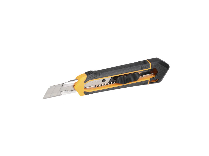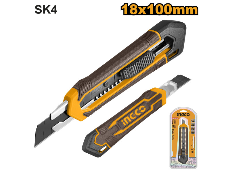Kézzel készített, papírvágás, bőrvágás, stb.Az anti-csúszás erő gomb megakadályozza a csúszást erő hatására. A tok végénél egy farokfedél található a penge végén, amit ki lehet húzni és eltörni a tompa pengefej eltávolításához. A pengén SK4 fekete penge található, ami élesebbé teszi a vágást, tartósabbá és nem könnyen rozsdásodik. A penge nagy területen van bevonva gumival, ami kényelmesebbé teszi a fogását.Penge méret: 18 x 100 mmHossz: 179 mmSK4 penge (HKNSB112)Automata zár Szállítási terjedelem: 1 db törhető pengés kés, Bliszterben